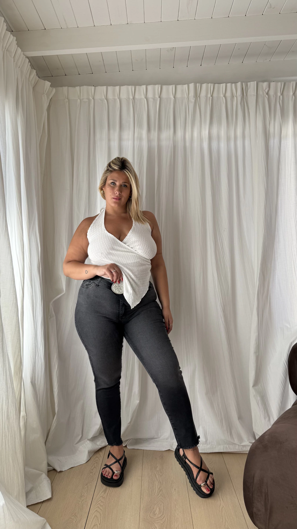 DETALLES: BRETEL P/ATAR AL CUELLO - ESCOTE CRUZADO - FRUNCE LATERAL - TERMINACION EN PICO